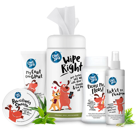Captain Zack Dog Fleadom kit for All Breeds | Ultimate 6-in-1Groom-Kit for Your Dog | Shampoo + Conditioner + Dry Shampoo + Paw Butter + Cologne + WipesI pH Balanced & Paraben Free